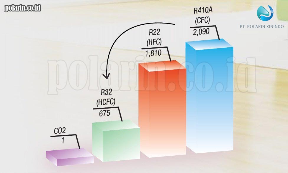 Refrigeran / Freon R32 ini memiliki dampak pemanasan global yang lebih rendah dengan nol atau tidak adanya penipisan lapisan ozon yang diakibatkan dari penggunaan R32 ini.